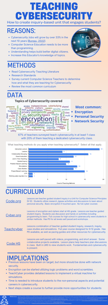 As the seven weeks of action research finished, I discovered I still enjoy doing research. Knowing you are passionate about your topic moves you forward. I was able to gain insight into my teachings. I have been utilizing the most common cybersecurity topics in my classroom: password security, online digital safety of personal information, etc. I have learned more about social engineering (malware, phishing, baiting). I have also looked at teaching how to secure your hardware and looked at simulations for network attacks. Schools need to broaden Computer Science courses to include networking and cybersecurity, not just programming.